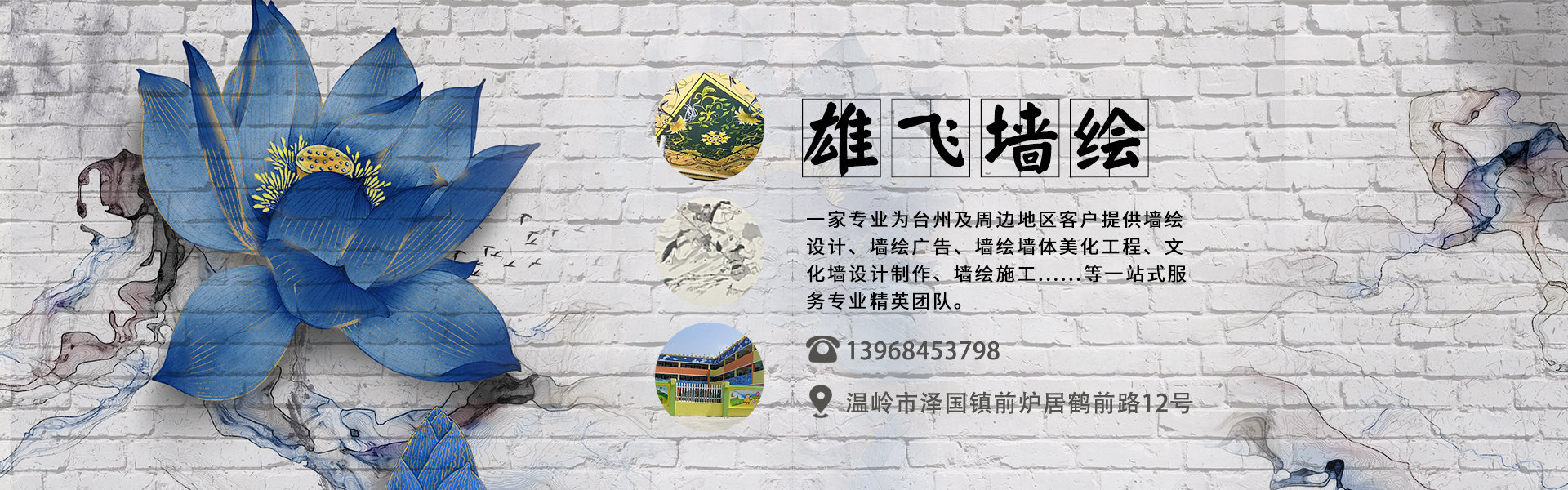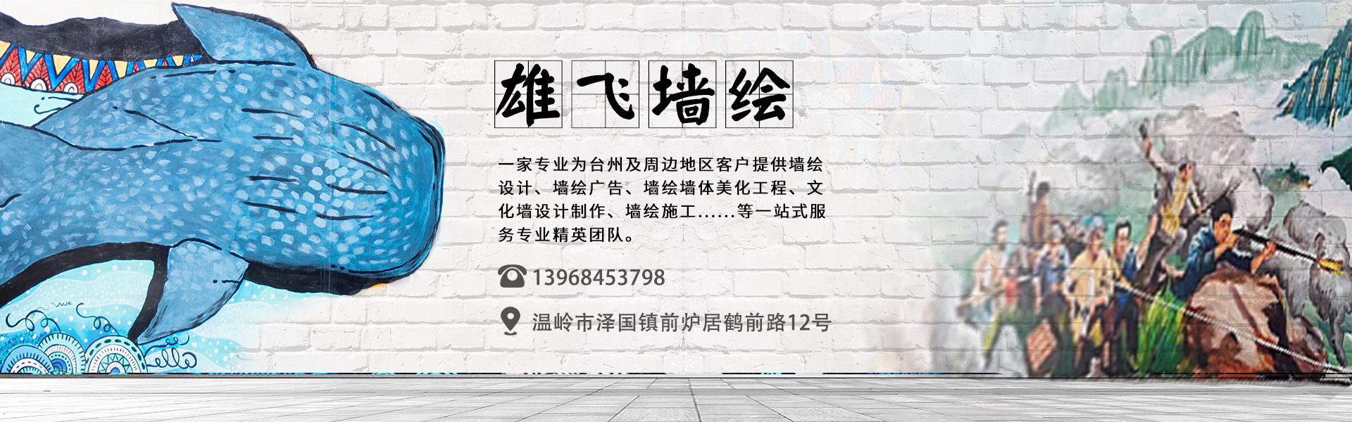 臺州市雄飛墻繪有限公司 ? 位于臺州溫嶺市,是一家專業為臺州及周邊地區客戶提供墻繪設計、墻繪廣告、墻繪墻體美化工程、文化墻設計制作、墻繪施工......等一站式服務專業精英團隊。畫師均畢業于中國美院、西安美院等各...